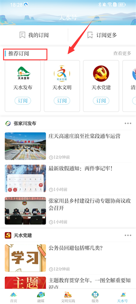 5、点击【天水号】也就是我们的个人账号,平台会给大家推荐优质的公众号,大家可以选择自己感兴趣的订阅,订阅之后可以第一时间收到该平台发布的一些最新新闻资讯,便于第一时间掌握。