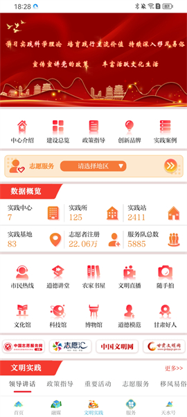 3、在【文明实践】栏目中,输入自己的所在地区,会有一些本市的活动,本地新闻,以及一些相关的道德课程等各种本市信息都能在这里查询;