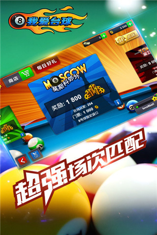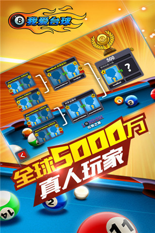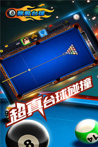 我爱台球(8 ball pool)是全球最火爆的真人联网对战台球游戏,全球五千万真人玩家,在这里你不论是高手还是菜鸟,都能找到适合自己的真人对手,大战三百回合不是空谈,与真实台球一样的打球体验,高质感的游戏画面,超低流量的要求,简单顺手的操作,精准的球路指导线跟拉杆力度,让你打起来得心应手,彻底爽翻到底!