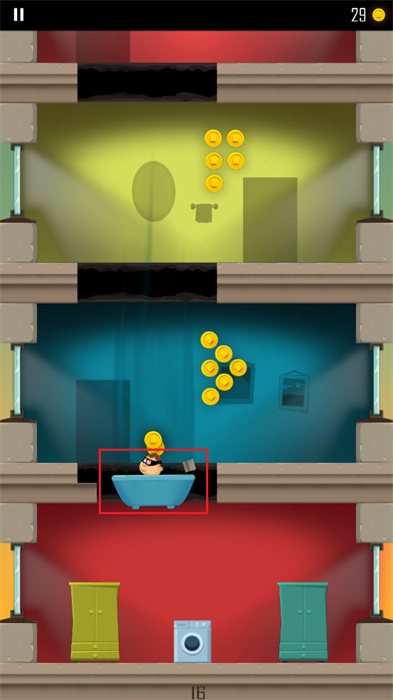 笔者非常喜欢看到浴缸就跳下去,因为跳进浴缸就会和浴缸一起往下掉好几层楼,除了安全之外,就是超强的破坏力和更多的金币!而且只要能越往下面的楼层迈进,分数就会愈高,经验值也会愈多。