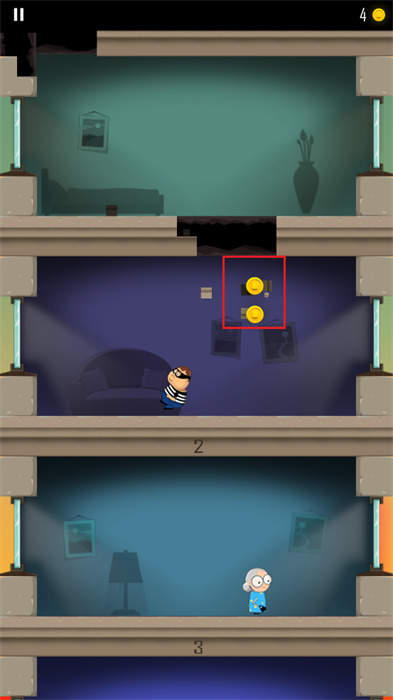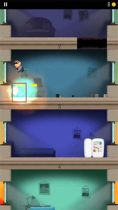 游戏的画面非常简单而且可爱。注意到冰箱,冰箱可以让你拥有短时间内无敌的效果!如果准备好要往下跳了,就在画面上往下拨动。可千万不要忘记拿走所有金币了!另外你可以踩坏(破坏)家具等等物件来获得金币!