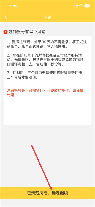 4、点击下方的按钮,按照后续提示完成账号注销。