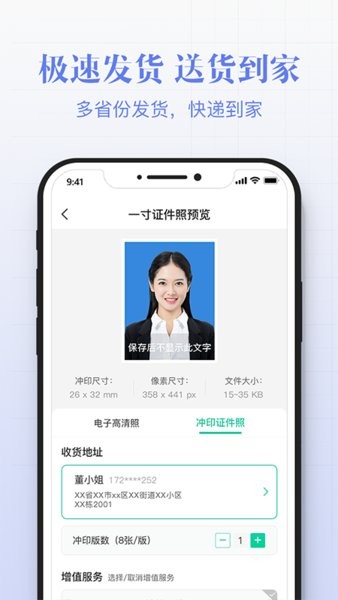 我们为了方便您的体验更好,新增了照片打印功能,一键即可打印,支持在线下单+证件复印冲印,快递到家,让您足不出户即可获得完美证件照!