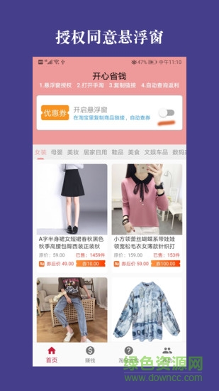 开心省钱app是一款为用户聚合提供各种优惠券省钱信息,并且更人性化的为用户提供通过悬浮窗帮用户更好的搜索优惠券功能的APP。已上架华为的应用商店
