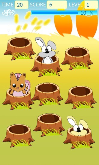 树桩打兔子是一款休闲益智类手机游戏,玩家需要用树桩将冒出来的兔子打到,兔子中还夹杂着松鼠,不能用树桩打松鼠否则会扣分的,游戏操作简单,喜爱的朋友赶快下载体验吧!