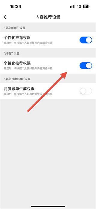 4、在内容推荐设置页面,找到个性化推荐权限对应的开关,点击即可关闭该权限。