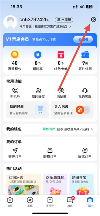 1、在菜鸟app个人页面,点击右上角的设置图标,进入设置界面。
