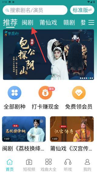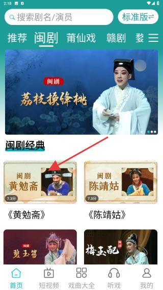 1、打开APP进入首页,找到并点击闽剧标签,即可切换到闽剧专属内容页面,浏览所有闽剧相关视频。