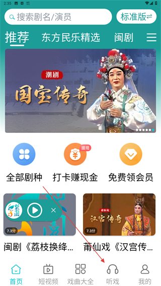 1、打开梨园行戏曲的APP,在首页点击导航栏中听戏。