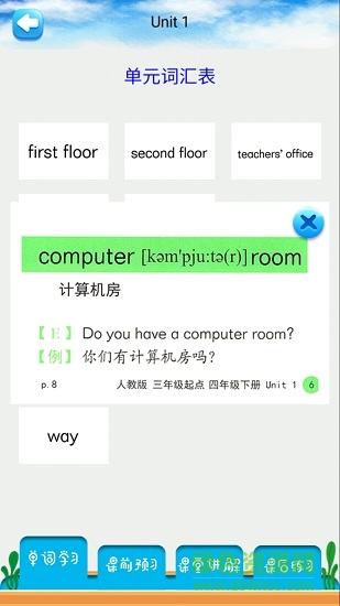 四年级下册英语解读(人教版),收录了人教版小学四年级英语下册的全部单元和每一单元的单词和语法。通过朗读的方式学习每一单元,并配有每一单元的解析,以及每一单元的单词词练习。通过课前预习,课堂学习,课后练习三个步骤的方式学习课文!产品围绕课本点读、听力测试、词汇练习、课本配音等核心功能,专注于解决小学生英语学习!