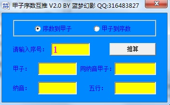 甲子序数互推是一个道教计算娱乐辅助工具,用于周易六十甲子的推算,可以帮助用户快速推算出甲子序号及纳音,欢迎下载使用。
