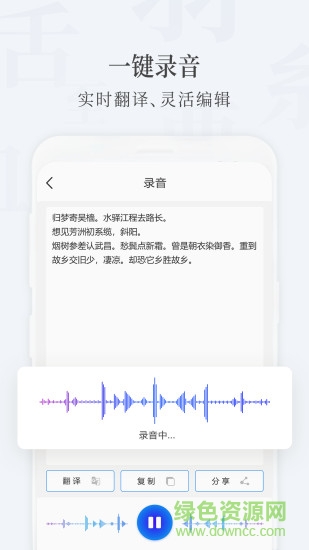 提供保存录音音频、识别文本、翻译文本为音频文档,办公文档功能,可分享文档至微信、 qq等社交软件,支持文档管理,分享功能。