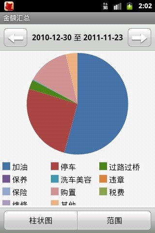 爱车达人提供任意时间段内各种费用的汇总统计,可以画出柱状图或饼状图。通过直观的图表信息,让您实时掌握爱车费用开支。