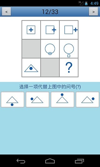 国际标准智商测试是一款休闲益智类手机游戏,游戏一共有33道题,内容主要涉及数学几何,非常考验玩家的逻辑推理能力、想象力和判断力用最权威的国际标准题目测试,保证权威,喜爱的朋友赶快下载体验吧!
