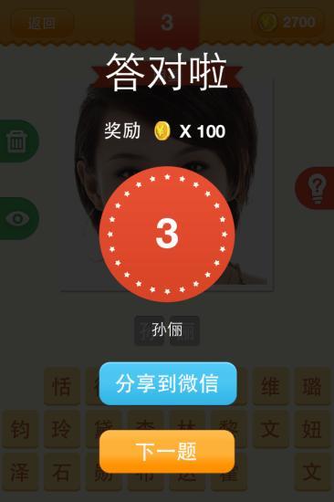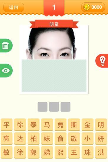 疯狂明星脸是一款通过一张明星的图片来猜明星的游戏。游戏会展示一张被遮了一半的脸让玩家去判断是哪个明星并提供了许多提示关键字,玩家只需将名字点击出来便可过关,不过游戏越到后期出现的人物也会越偏并且展示的部分也越来越小,好在游戏提供了提供功能跟好友帮助功能,这让许多玩家不至于卡在一关动弹不得,这款游戏总体上还是挺新颖的,喜欢的玩家赶紧试试。