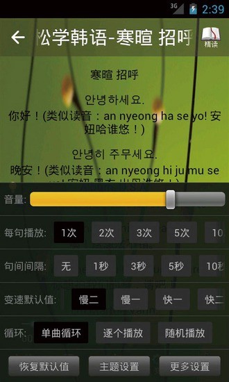 4.可离线学习,句句朗读,快慢语速调节,单句定向朗读,可设置复读次数,句间间隔时间,中韩文字幕切换,跟读对比互动学习,全文内容辅导,屏幕查词
