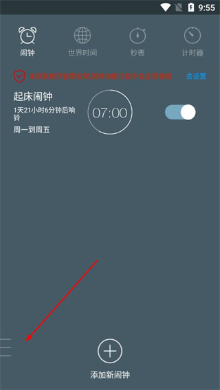 1、打开最美闹钟,在闹钟页面点击左下角的菜单按钮。