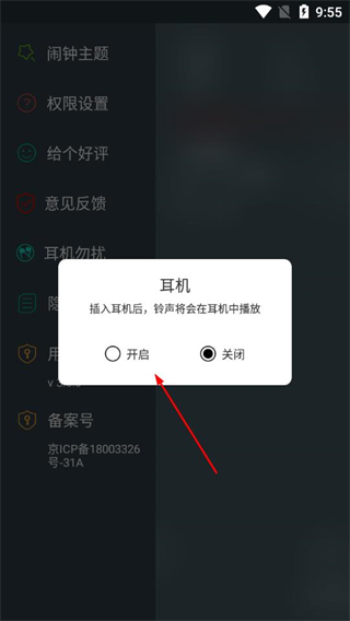 3、在耳机设置弹窗里,选择开启选项,即可启用耳机模式。