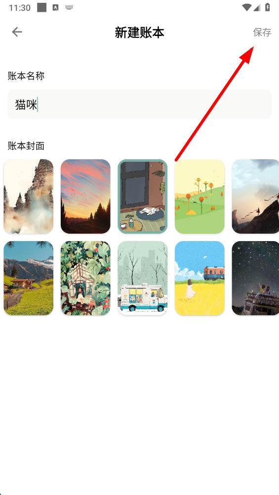 4、在新建账本界面,输入账本名称,选择喜欢的账本封面,然后点击右上角的保存按钮,即可成功新建账本。