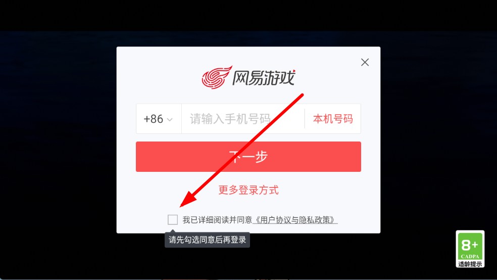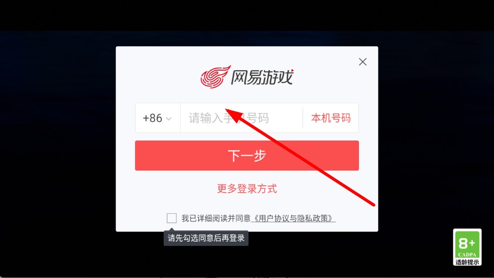 1、在网易游戏登录弹窗中,点击标有请输入手机号码的输入框,准备录入用于登录的手机号码。