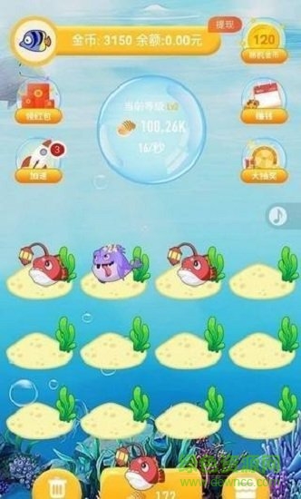 开心养鱼场领红包游戏中能赚钱提现,游戏的玩法也是十分的简单的,轻松的养鱼玩法,并且每天登陆还可以打卡,将小鱼不断的升级合成来赚更多的钱,也没有时间的闲置想要就玩,鱼的等级越高,获得的红包金额就会越大喔,快叫上你的朋友也来领取奖励吧!