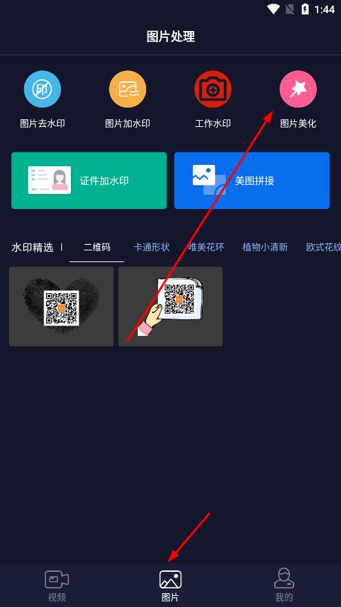 1、打开秒去水印APP,进入图片选项,点击图片美化功能按钮。