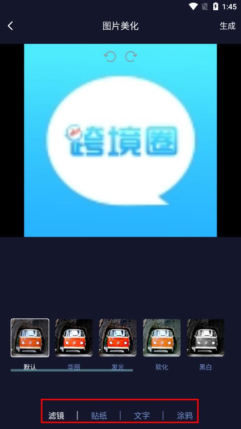 3、进入图片美化界面,可通过滤镜、贴纸、文字、涂鸦等选项对图片进行美化。
