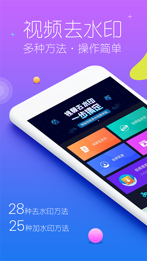 一键无痕短视频去水印。照片去水印,视频去水印软件。不仅仅是去水印,可以去除图片中一切不想要的东西。去掉文字,去掉杂物。只需要在想去掉的地方,涂抹、覆盖、贴花、模糊等诸多方法,秒去水印。一键去水印,支持多种视频编辑处理,去除视频水印、裁剪视频尺寸、裁剪时长、视频画布、视频配音、视频倒放、视频压缩等功能。