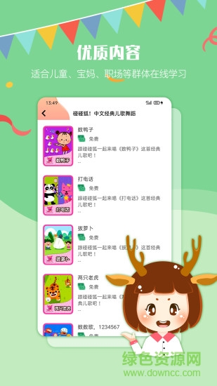 重点为少年儿童、新进宝妈、适龄人群提供在线学习英语、办公软件、口才、商务礼仪、舞蹈、声乐、美术等优质内容而打造。