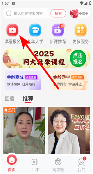 1、在网上老年大学的首页,点击课程报名,进入选课报名页面。