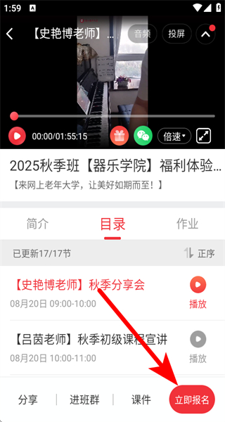 4、在课程详情的页面,点击立即报名,完成课程报名的操作。