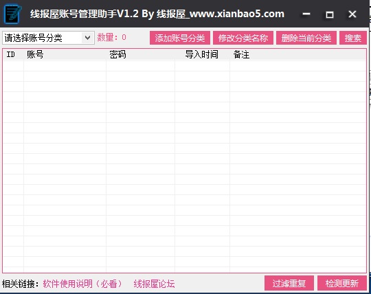 线报屋账号管理助手是由线报屋论坛出品的一个管理账号的小工具,对于有许多网络账号要保存的人来说非常实用,支持批量保存以及单账号的添加,支持复制单账号、单密码、账号+密码全部复制,可把账号批量导出为文本