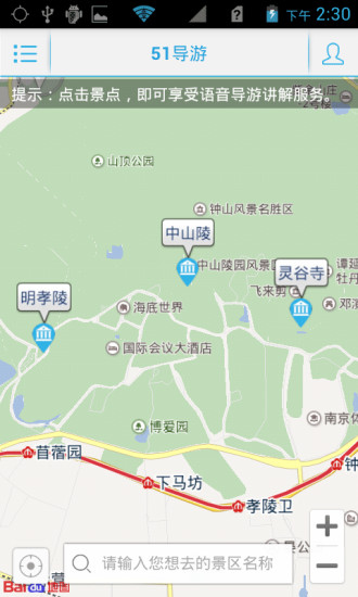 51导游是南京五一行信息科技有限公司开发的一个以百度地图为基础的景点语音讲解app,为一些对景区不是很了解的客户提供了便利,景区相关信息都可以用这个app查到,非常的方便,欢迎下载使用。