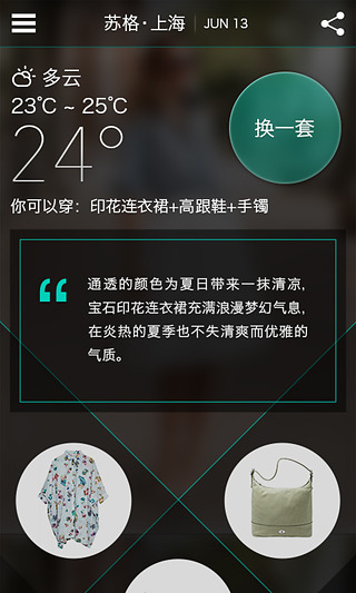 苏格天气衣报是一款教你如何穿衣搭配的app,专为女性解决出门穿衣难的问题。软件非常智能化,从个性化测试、全球街拍示范以及每日心情路线出发,提供出门穿衣的最佳解决方案。软件还提供各种时尚杂志,致力于成为新生代女孩的“消费参考”和“生活顾问”。