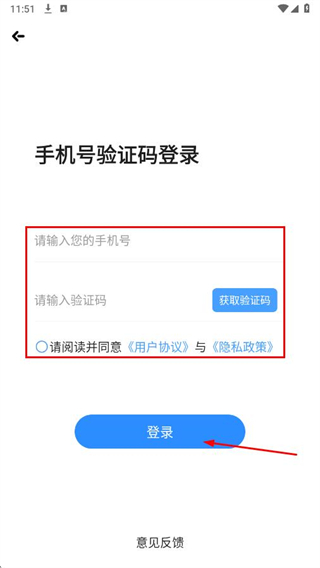 3、输入手机号码、验证码,勾选用户协议,点击登录,完成账号登录。