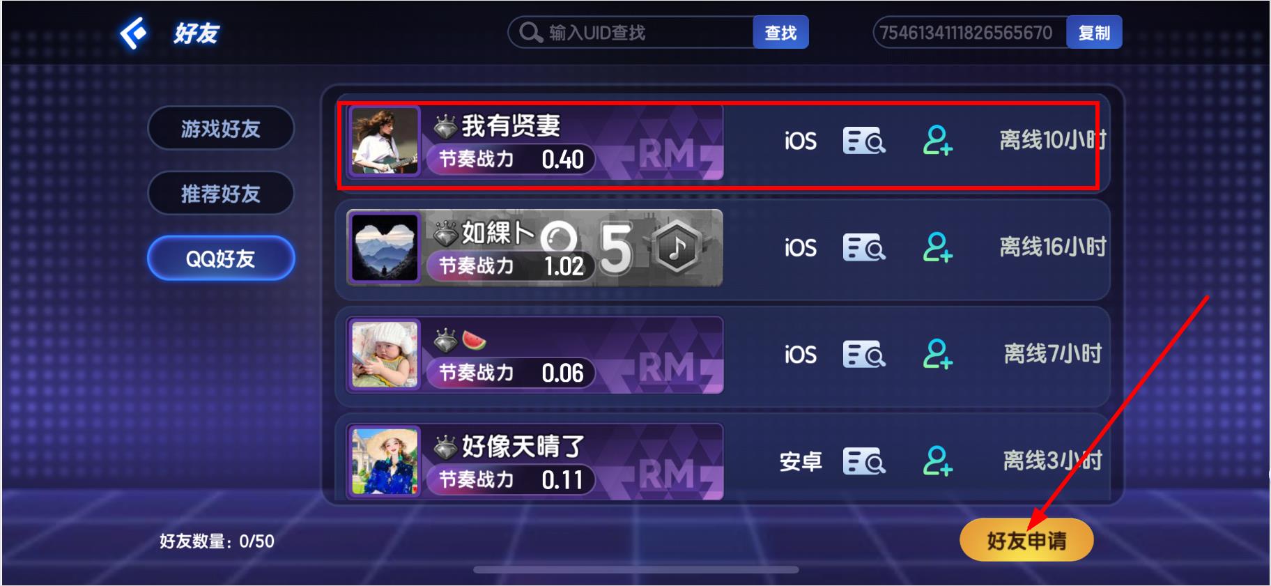 4.选中好友后点击下方的好友申请按钮,即可发送好友申请。