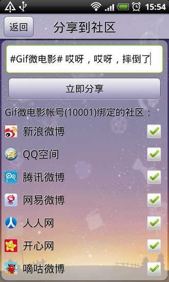 3.Gif微电影可即时将片段一键分享到新浪微博、腾讯微博、qq空间、人人网、开心网、嘀咕网等多个社区,且只需一份的流量。由于自主创新的高压缩算法,gif微电影虽以小片段呈现,却不会比静态图片耗费流量。