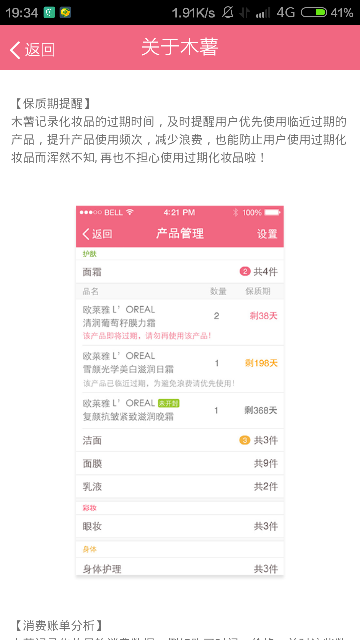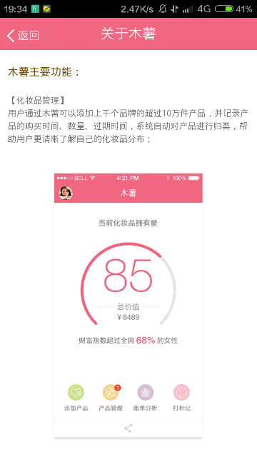 木薯内置化妆品管理工具,可以添加上千个品牌的超过10万件产品,并记录化妆品的过期时间,及时提醒优先使用临近过期的产品,并提供化妆品消费账单分析。