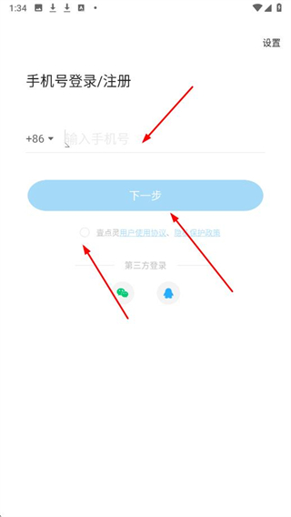 1、打开抑郁焦虑测试APP,在手机号登录/注册页面,输入手机号,勾选“用户协议,点击下一步。