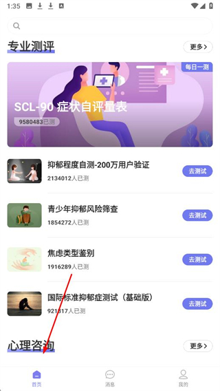 3、完成验证码输入后,即可注册账号并进入APP首页,可进行专业测评。