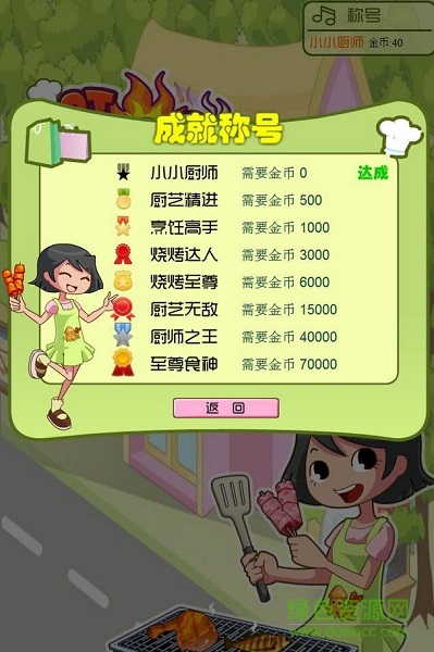 美味的烤肉,香气扑鼻的烤鱼,松脆可口的烤土豆,你喜欢吃哪个呢?这里的食材都是最新鲜的哦!根据顾客的需求进行烧烤可以赚得大把的金币咧!赚得金币越多,获得的称号就越高级,看最终谁能成为万人景仰的“至尊食神”吧!?这里的食材都是最新鲜的哦!根据顾客的需求进行烧烤可以赚得大把的完美咧!赚得完美越多,获得的称号就越高级,看最终谁能成为万人景仰的“至尊食神”吧!