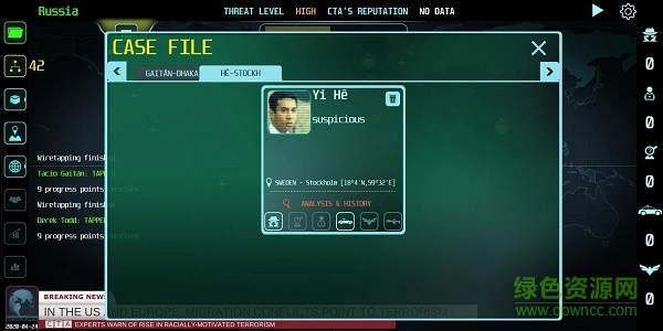 在游戏中你将扮演一名反恐专家,加入 CTA - Counter Terrorist Agency(反恐专家组织),一个致力于阻止恐怖袭击的国际组织,使用现代监听技术,获取情报,寻找恐怖组织网络中的头目,并且阻止灾难的发生,体验和恐怖分子斗智斗勇的乐趣,刺激紧张的过程保证人你肾上腺素沸腾,你的一个错误决定,也许会让成百上千的平民死亡,你需要收集情报,并协调全球的反恐行动,责任非常重大。