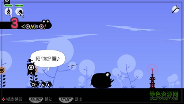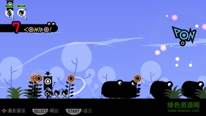 b、试玩版中只有两种音律,“Pon Pon Pata Pon”是攻击指令,“Pata Pata PataPon”则是移动指令,和太鼓达人这类游戏相似,只有节奏性的按键,且无错的连贯起来,才能能增加连击数。