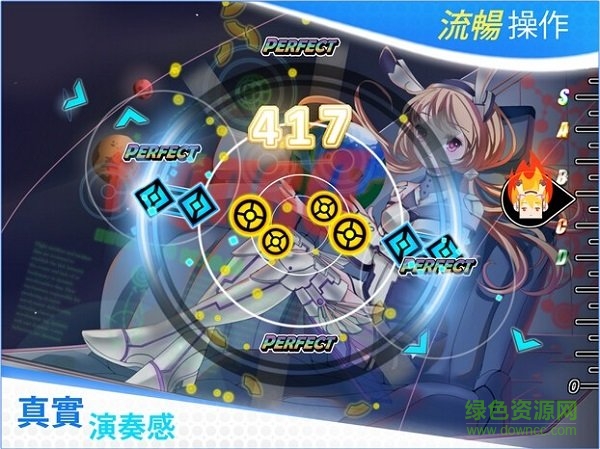 3.采用点击、滑动、长按三种经典音符玩法,只要按照节奏去按下音符就可以了,演奏的界面会随着音乐旋律、节奏发生变化,比如会旋转、位移等等,加上炫目的音符特效,让游戏画面相当带感。