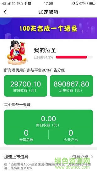 全民酿酒APP是酒类电商+广告平台。全民酿酒联合众多酒厂,去掉酒品销售所有中间环节,让用户厂价喝到纯粮好酒。用户免费参与全民酿酒晋级,通过收看广告获得酿酒的原料,原料越多,酿酒晋级越快,晋升到一定等级,即可获得平台的广告收益分配奖励。利用碎片时间一起来玩玩吧!