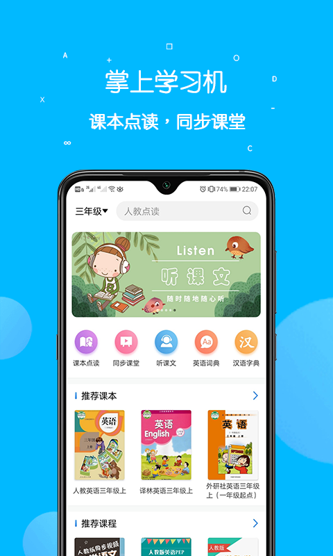 课本点读通APP同步教材智能点读学习机,集课本点读、同步课堂、听课文、课后单词、课外精选、英汉词典等工具于一体,让孩子轻松愉快学习。点读教材覆盖全国大部分版本,海量课内课外课程,名师讲解,英汉词典等学习工具可以帮助孩子提高学习效率,丰富的内容和简单的操作,真正做到给书本做减法,为知识做加法!