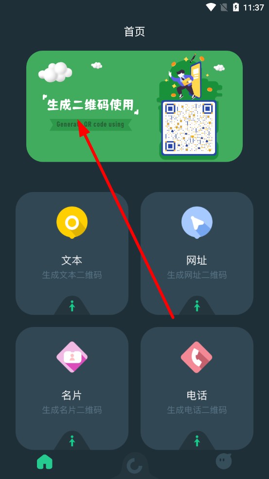 1、在应用首页顶部,找到带有云朵与人物插画、标注生成二维码使用的绿色横幅模块,点击进入对应功能页面。