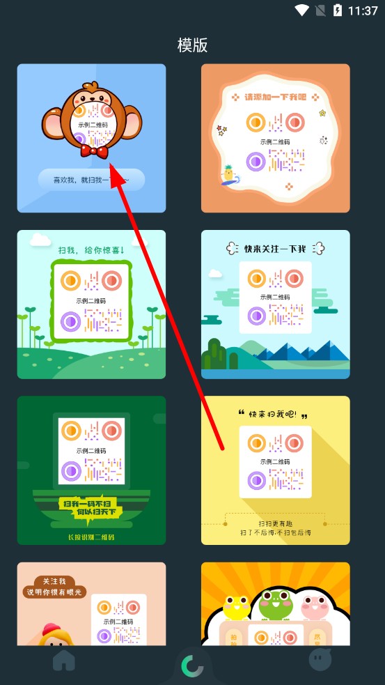 2、进入模板页面后,选择左上角处、带有猴子卡通形象及喜欢我,就扫我文字的二维码模板并点击。