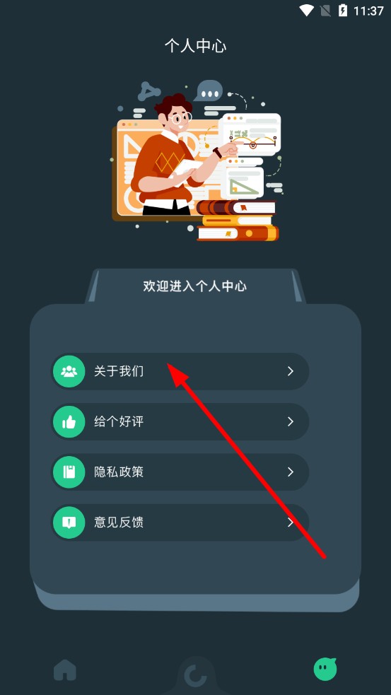 3、切换至个人中心界面,在欢迎语下方的功能列表里,找到标有关于我们的选项,点击查看相关信息。
