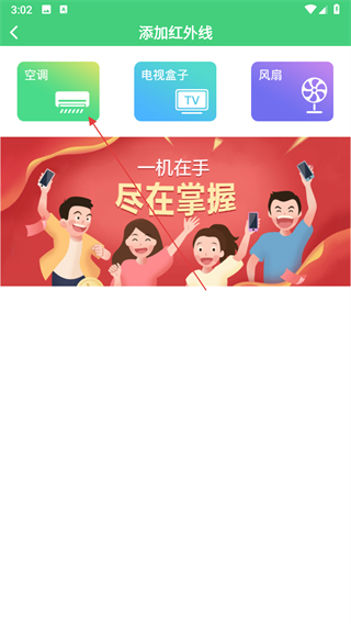 2、在添加红外线页面,点击空调选项,进入选择界面。